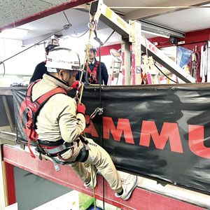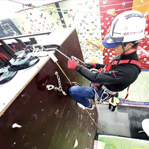 座学後の実技はスラブ壁を懸垂下降からスタート!